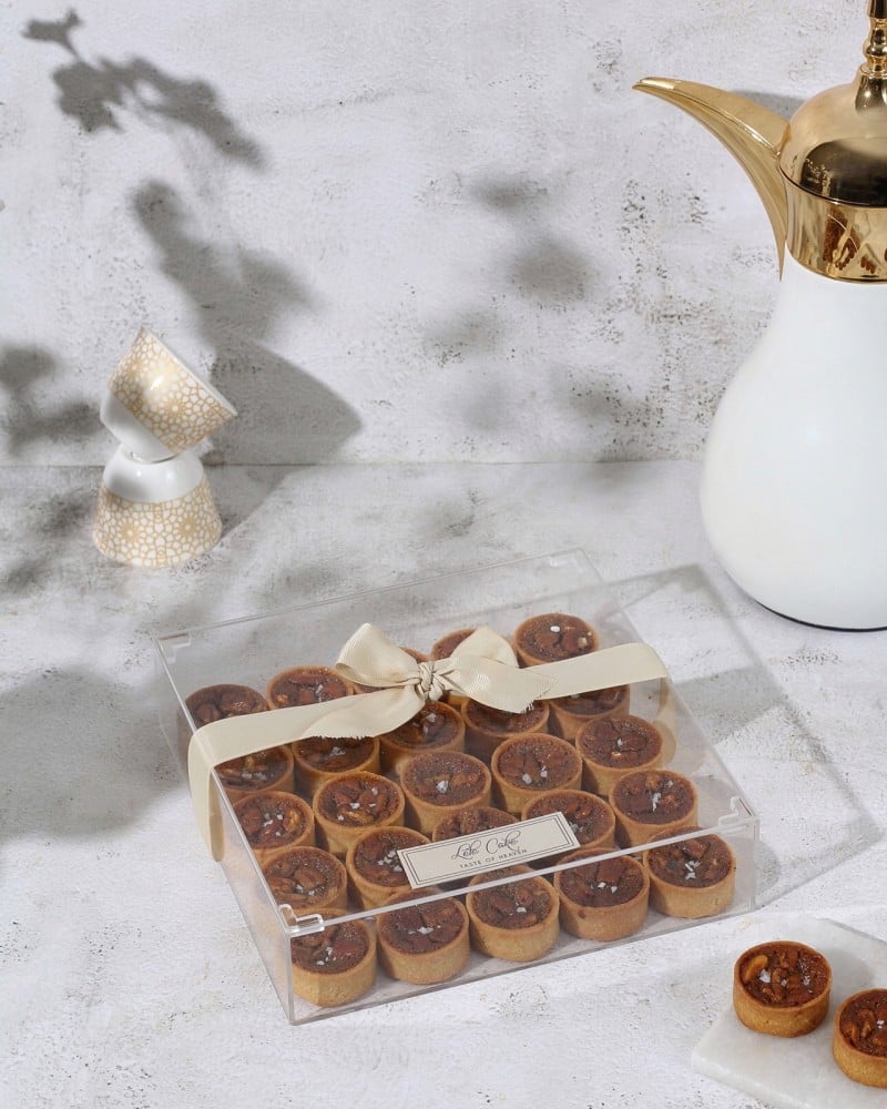 41 قطعة من تارت البيكان اللذيذ مع الكراميل والملح البحري في بوكس اكريلك مزين بشريطة .